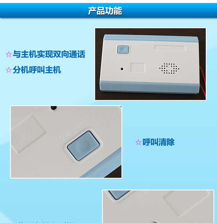 分機由兩部分組成:面板與手柄線組成。面板上有“呼叫/取消按鈕”及喇叭,手柄線有受話咪頭與按鈕。從護士站過來的聲音由面板上喇叭傳出。病人可以在床上按手柄線上的按鈕呼叫或面板上的“呼叫/取消”按鈕呼叫,服務人員到床前服務后可以按面板上的呼叫按鈕再取消呼叫。